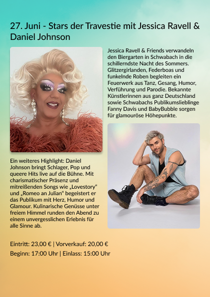 27.06.26 – Travestie mit Jessica Ravell & Daniel Johnson – Vorverkauf 20,00 €, Abendkasse 23,00 €